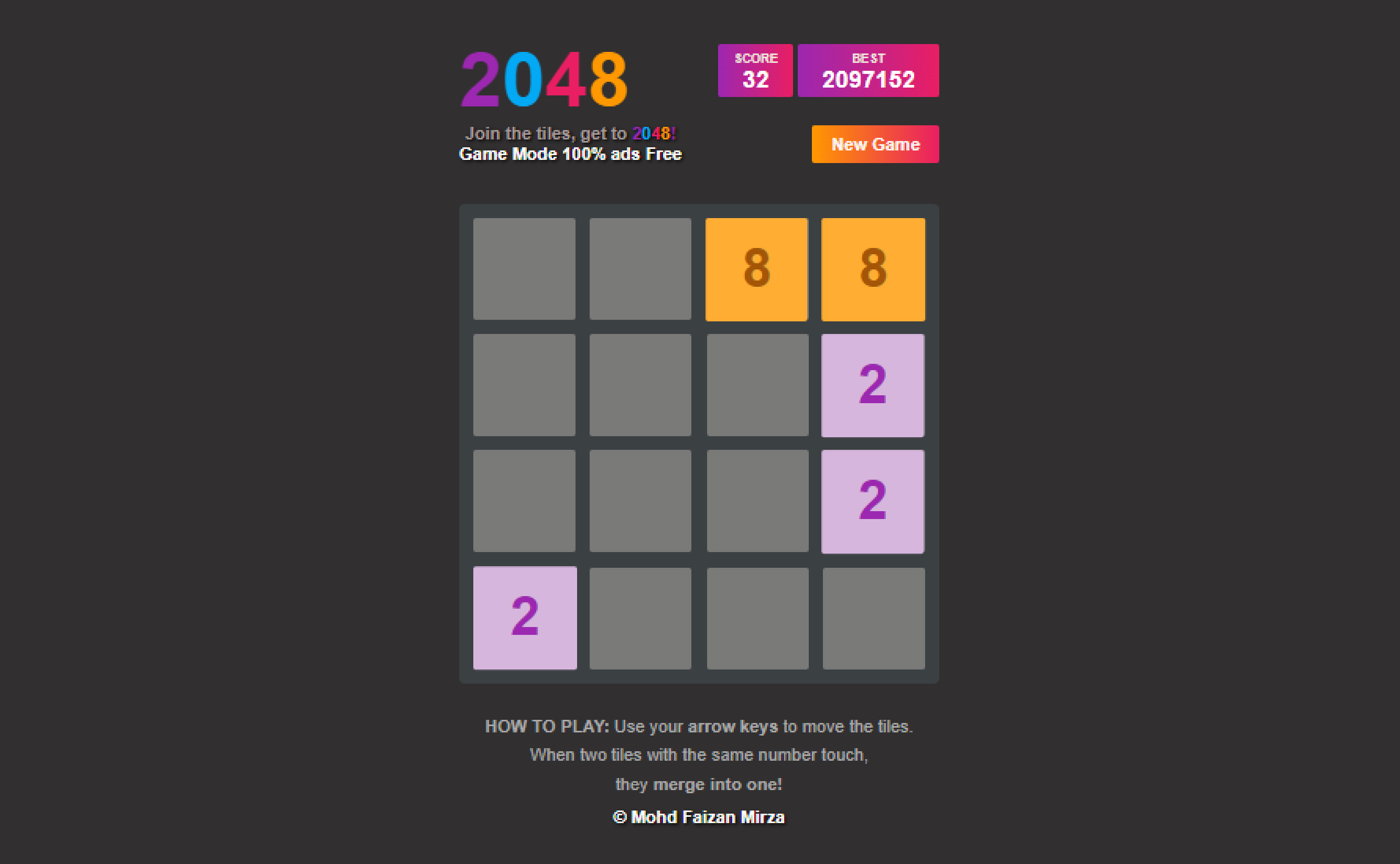 I created an ad-free version of the 2048 game by modifying existing resources. Frustrated by the excessive ads in other versions, I aimed to provide players with a seamless and distraction-free gaming experience. Through simple adaptations, I removed interruptions, allowing players to fully enjoy the addictive puzzle-solving challenges of 2048.
