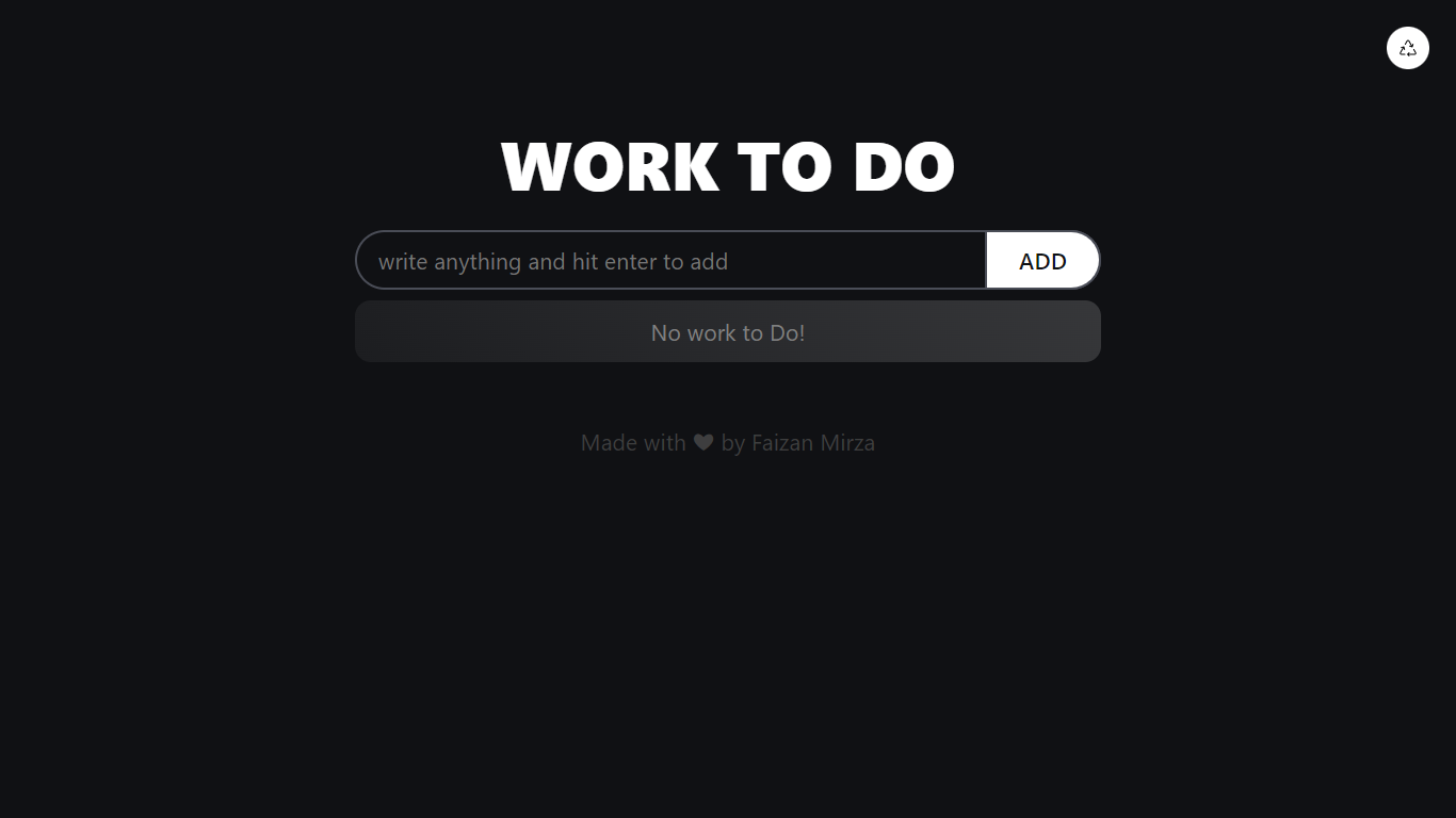 Introducing Work To Do – a sleek ToDo app built with HTML, CSS, and JavaScript. Effortlessly manage your tasks with features that allow you to add, delete, and even restore todos with ease. Enjoy a clean and intuitive interface that keeps you organized and focused on what matters. Start taking control of your productivity today!